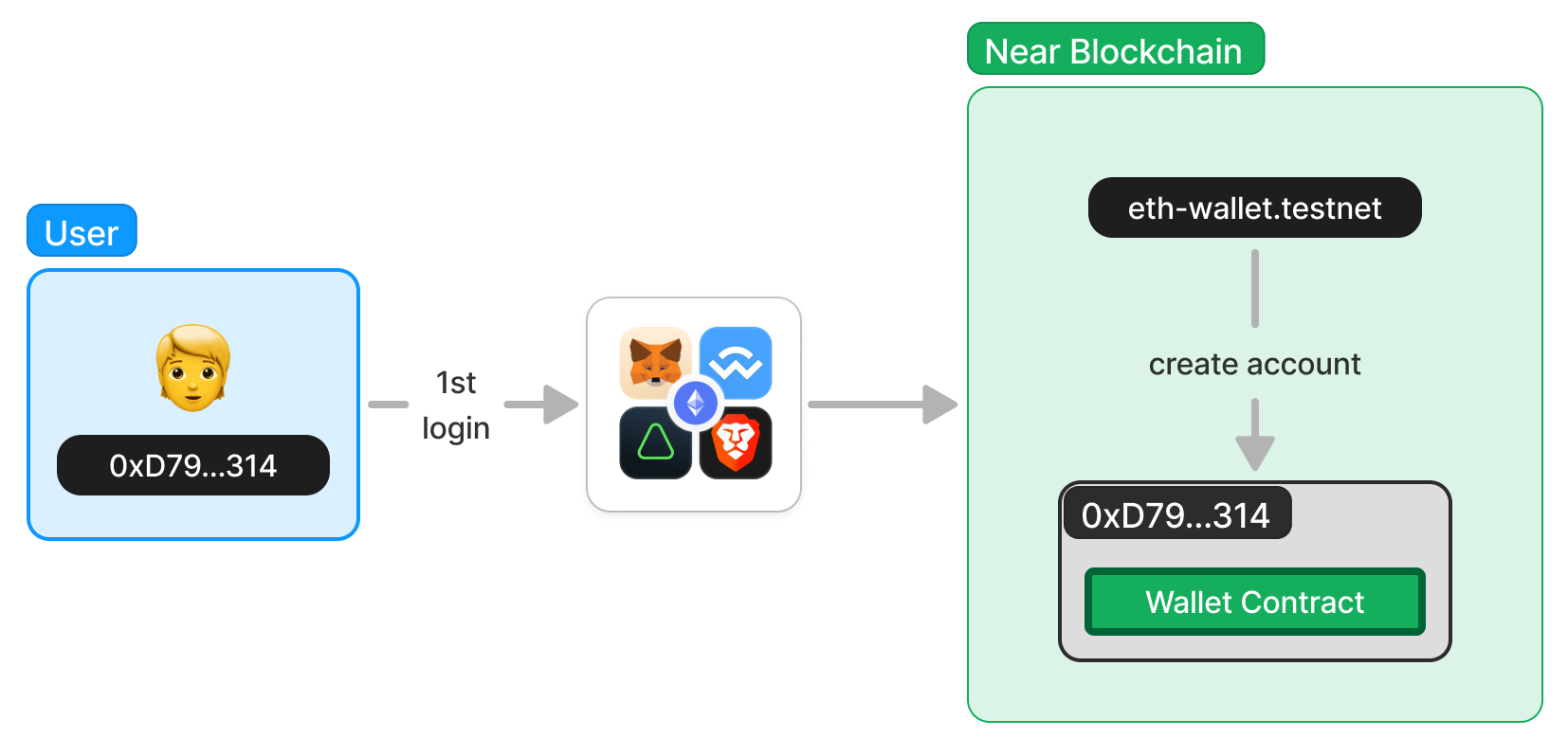 The first time you login, ethereum-wallets.near will create the Near account 0xD79...314 for you.