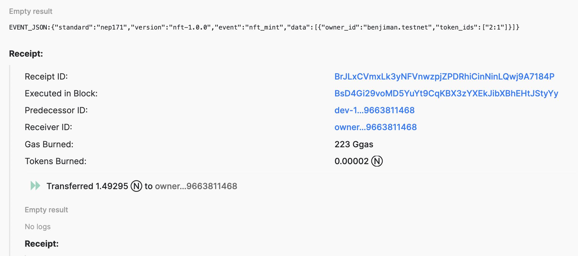 Log [nft_contract.testnet]: EVENT_JSON:{"standard":"nep171","version":"nft-1.0.0","event":"nft_mint","data":[{"owner_id":"benjiman.testnet","token_ids":["2:1"]}]}
